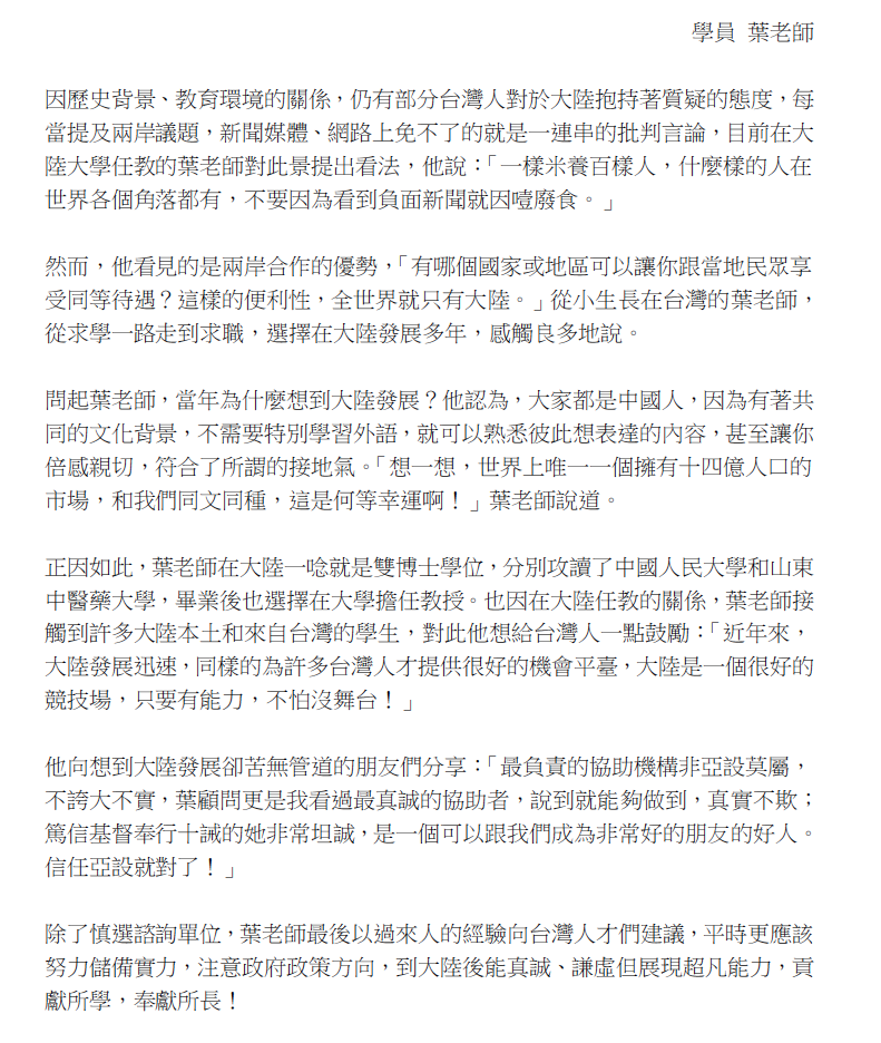 把握文化語言優勢 台灣人才接地氣 不怕沒舞台 ─ 學員葉老師
